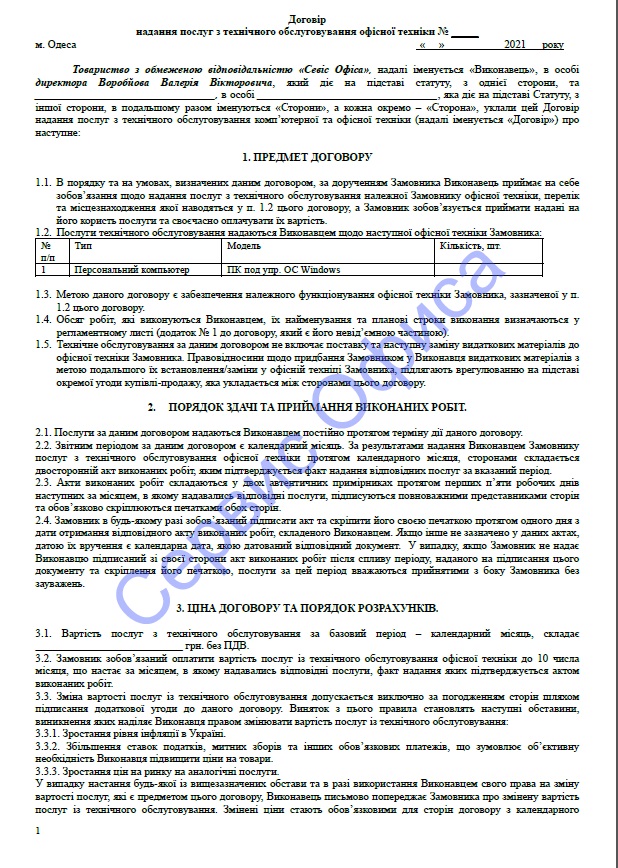 Договір на технічне обслуговування оргтехнікиУ Договорі обумовлюються права та обов'язки сторін, перелік техніки включається на обслуговування, порядок прийому робіт і вартість щомісячного обслуговування. ![]()